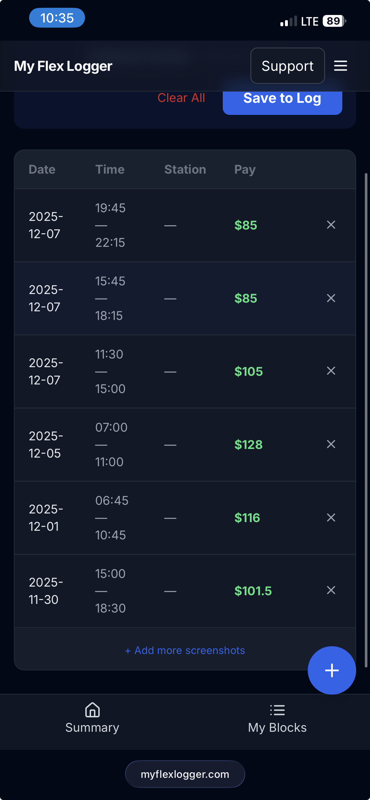 The first version of My Flex Logger is live! Track your blocks, mileage, and earnings securely on your own device.